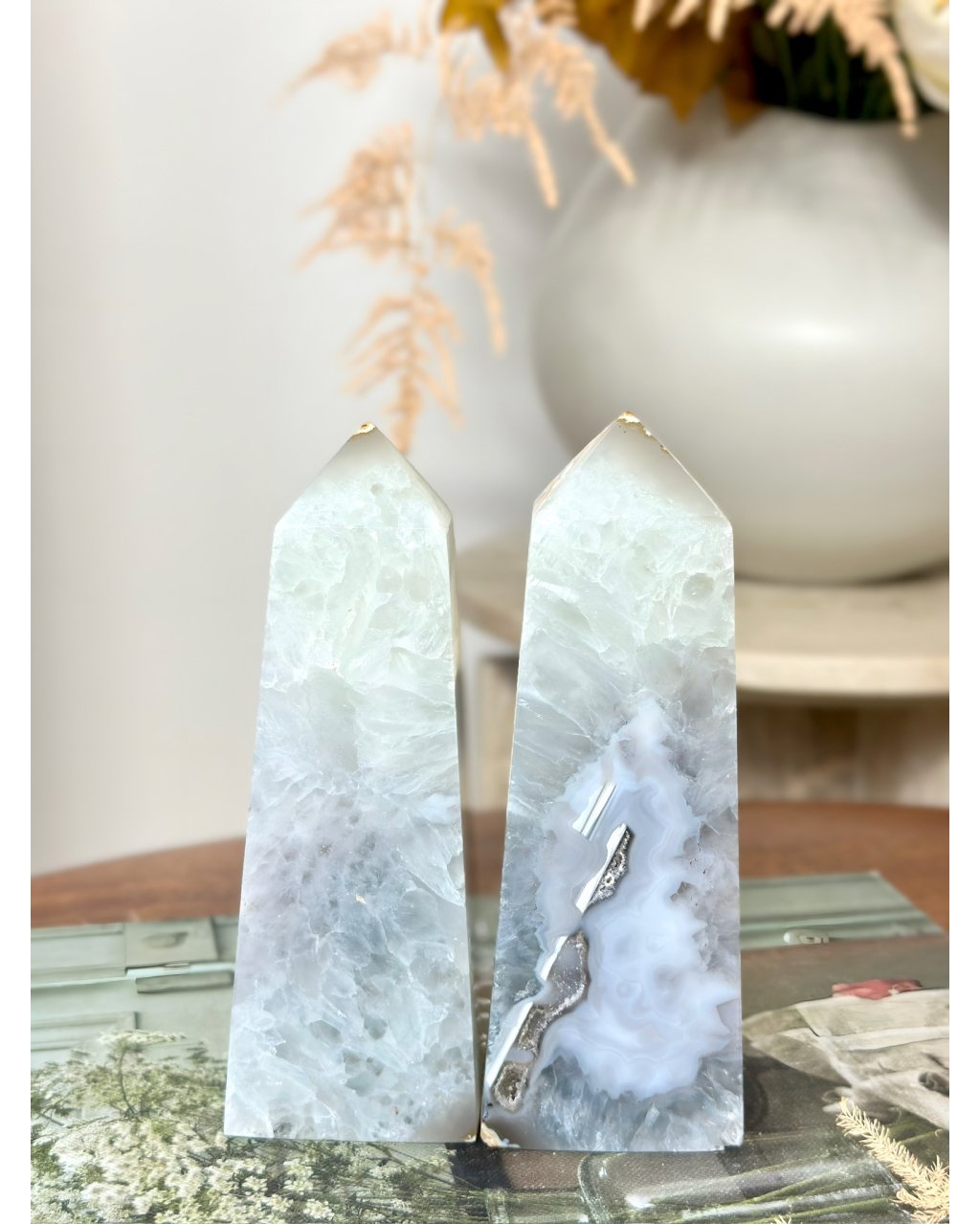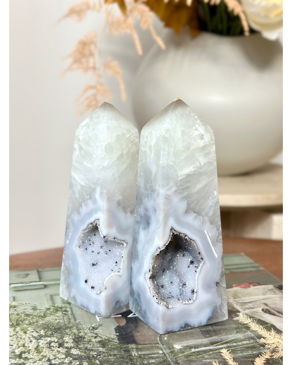 Tento párový achát je jako dvě poloviny jednoho srdce, zrozené z téže kamenné duše. Uvnitř se ukrývají jemné drúzy, které v sobě drží světelný prach Země, drobné krystalky, jež září jako hvězdy v nitru kamene. Každá z nich nese záznam o okamžiku, kdy se hmota proměnila ve světlo.
