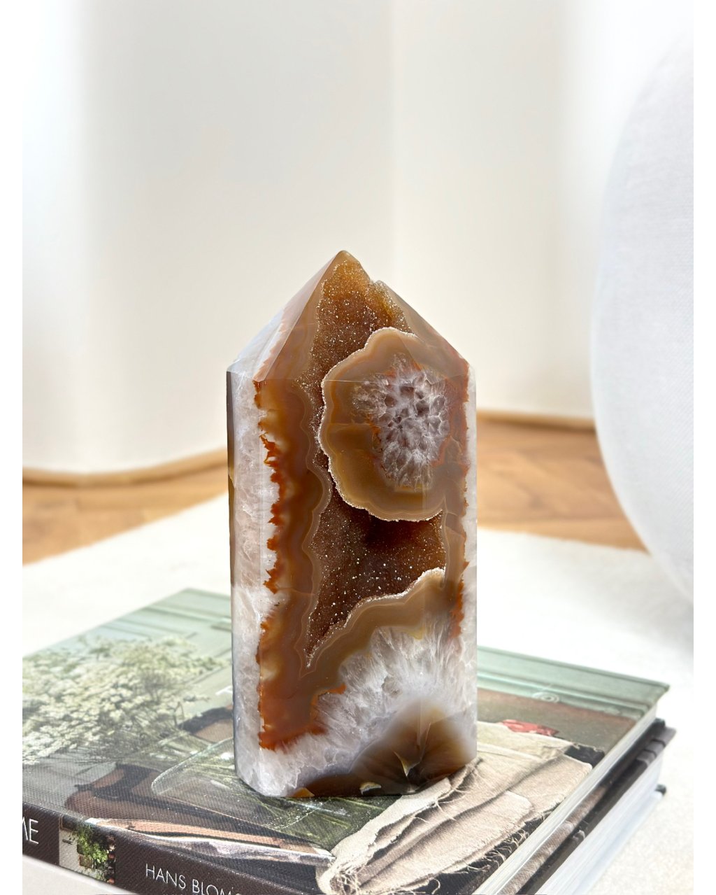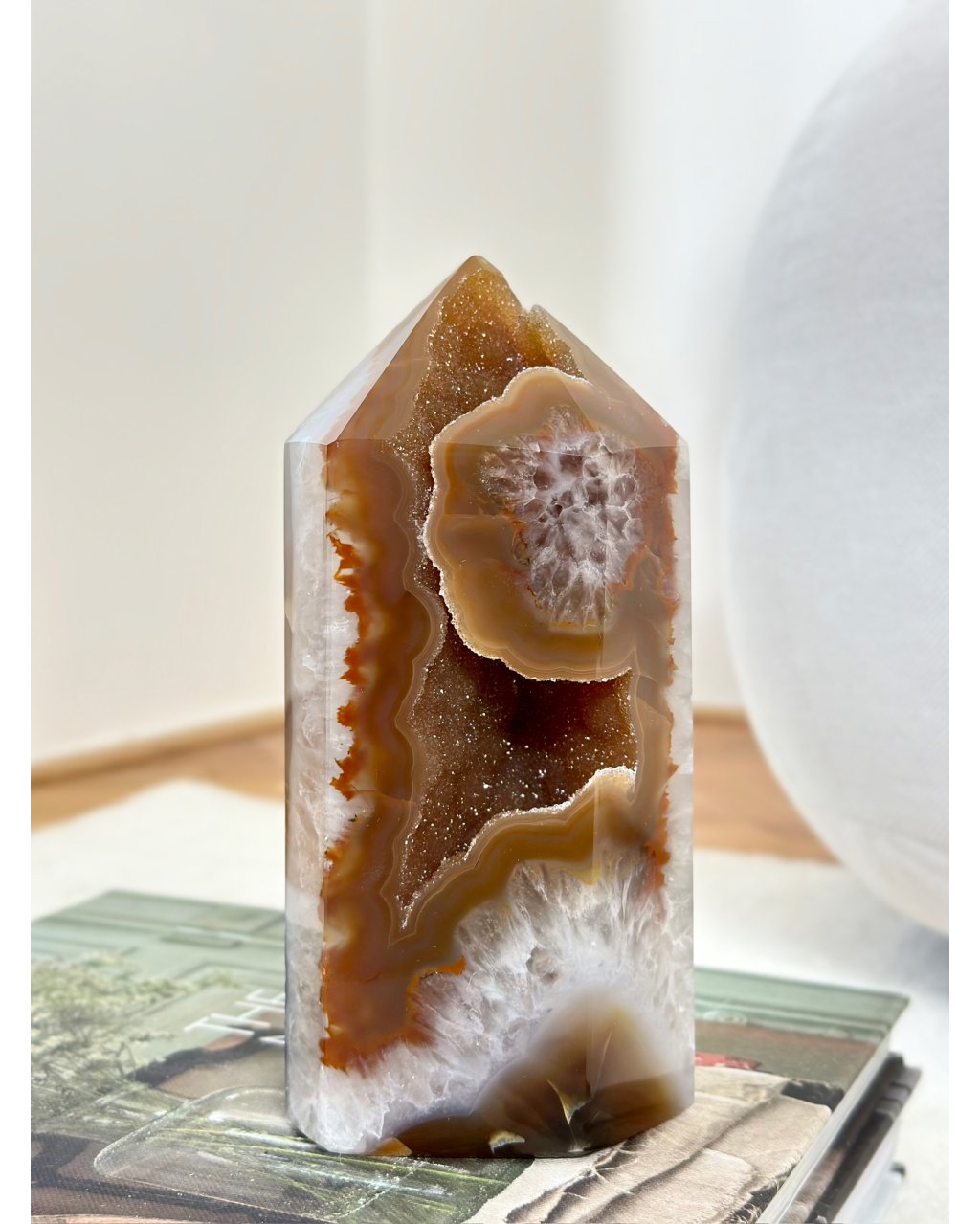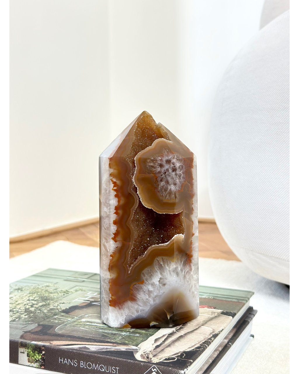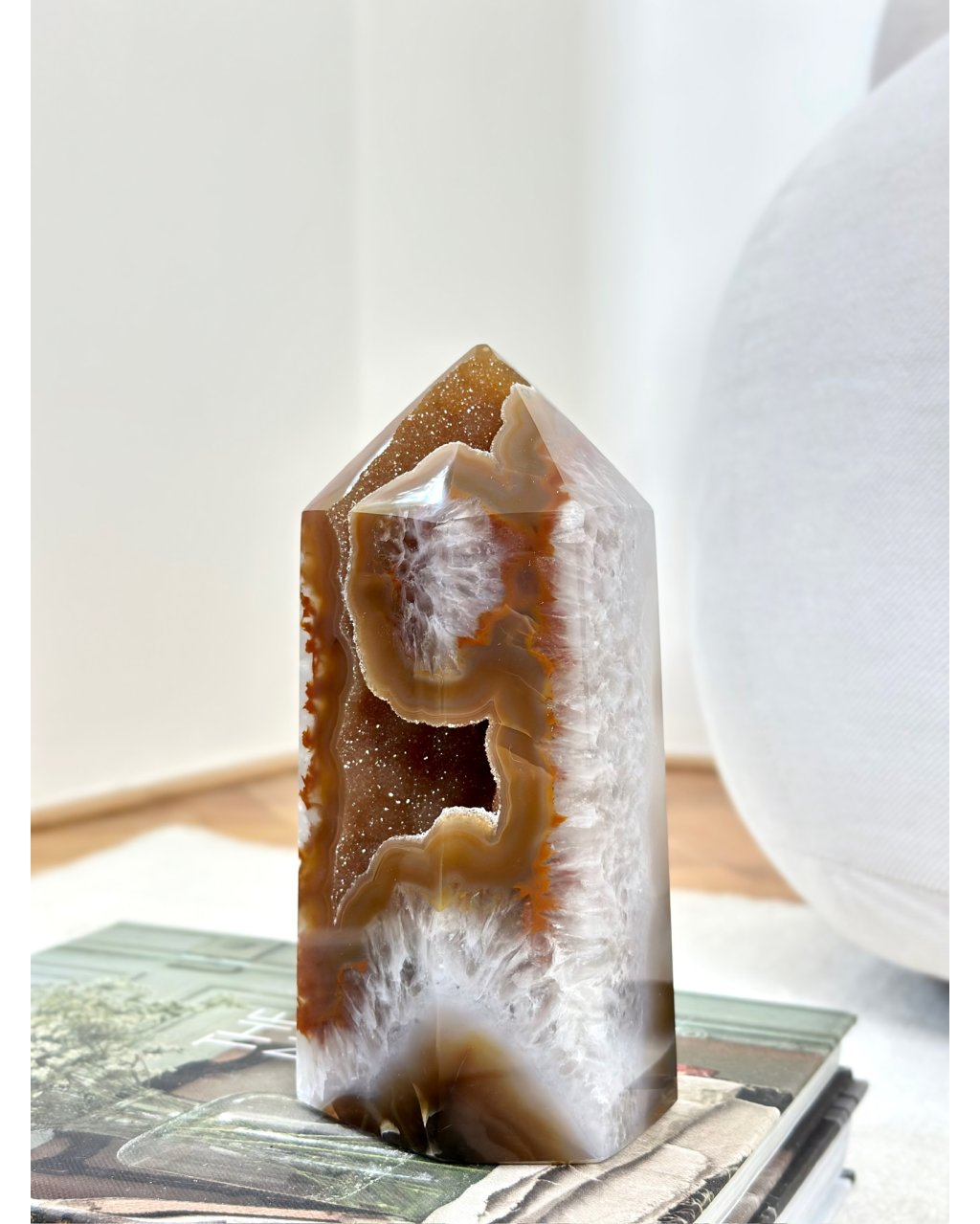 Tento velký hnědý achát s dlouhou třpytivou drúzou je nejen mistrovským dílem přírody, ale i energetickým spojencem pro všechny, kdo hledají klid, sílu a krásu v jednoduchosti.
