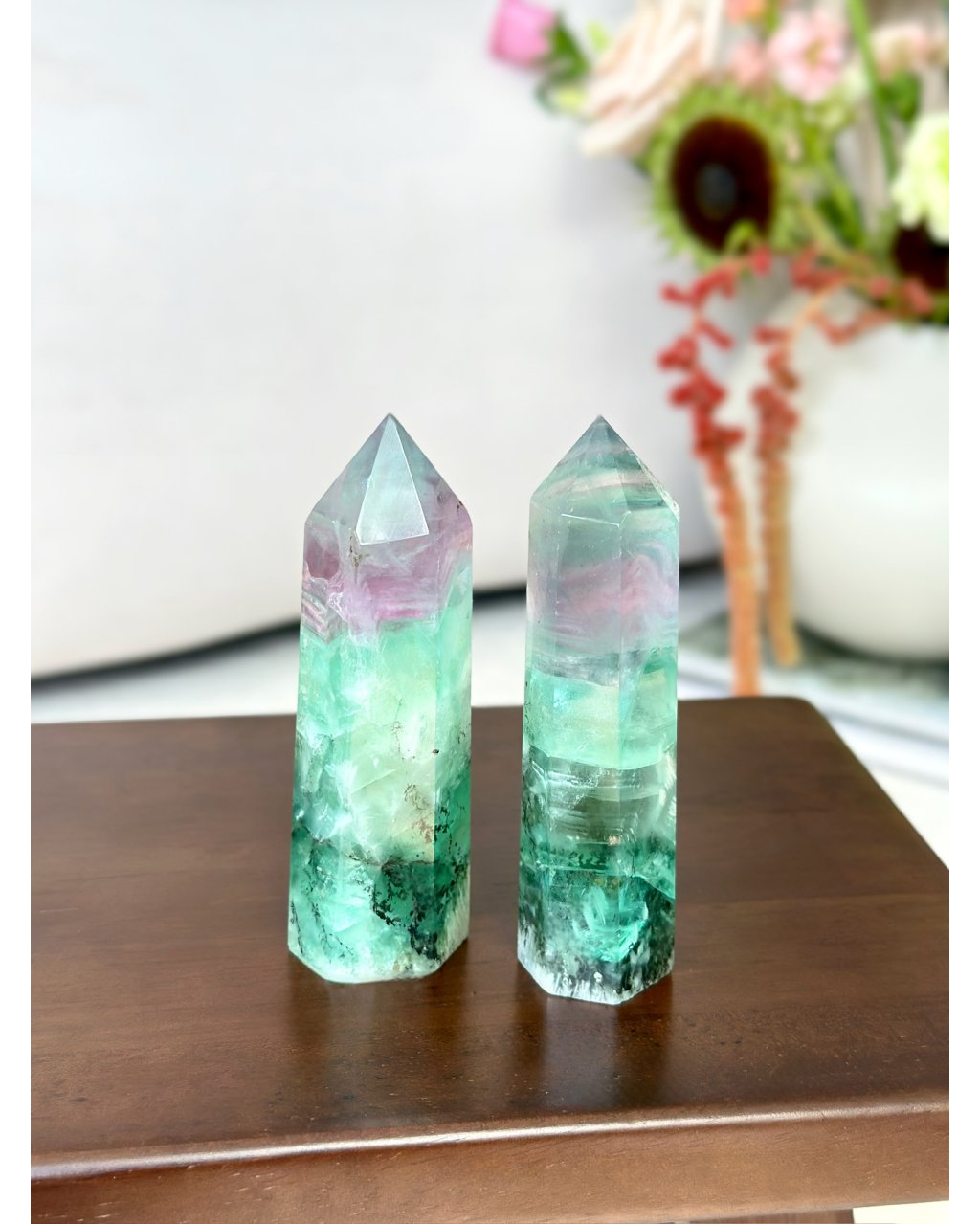 Fluoritový hrot s dendritem je vzácný klenot přírody, jehož vysoké světlo a průzračnost odhalují čistotu a sílu minerálu. Hrot směřuje energii vzhůru, jako by zachycoval samotný proud světla, a dendritické inkluze připomínají jemné stromové větve nebo říční sítě, malou krajinu ukrytou v krystalu. Barvy se prolínají od fialové přes zelenou až po průhlednou, každá vrstva září svojí jedinečnou intenzitou.