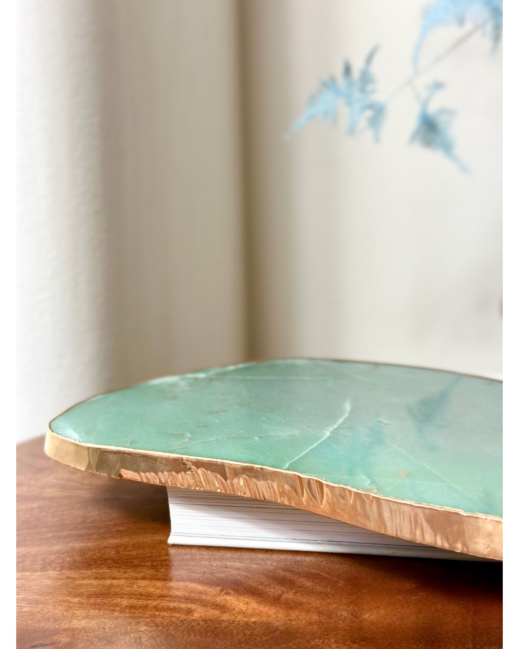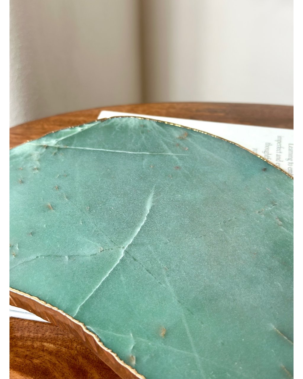 Zlaté lemování dodává desce nádech vznešenosti a zároveň symbolicky zesiluje vibraci hojnosti, ochrany a životní vitality. Spojení nefritu a zlata vytváří silnou alchymii energií, která podporuje proudění prosperity, posiluje sebedůvěru a přináší do prostoru pocit stability a noblesy. Tento harmonický kontrast přírodní zeleně a teplého zlatého tónu činí z desky nejen energetický nástroj, ale i nepřehlédnutelný estetický prvek.