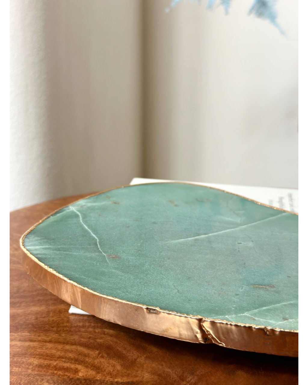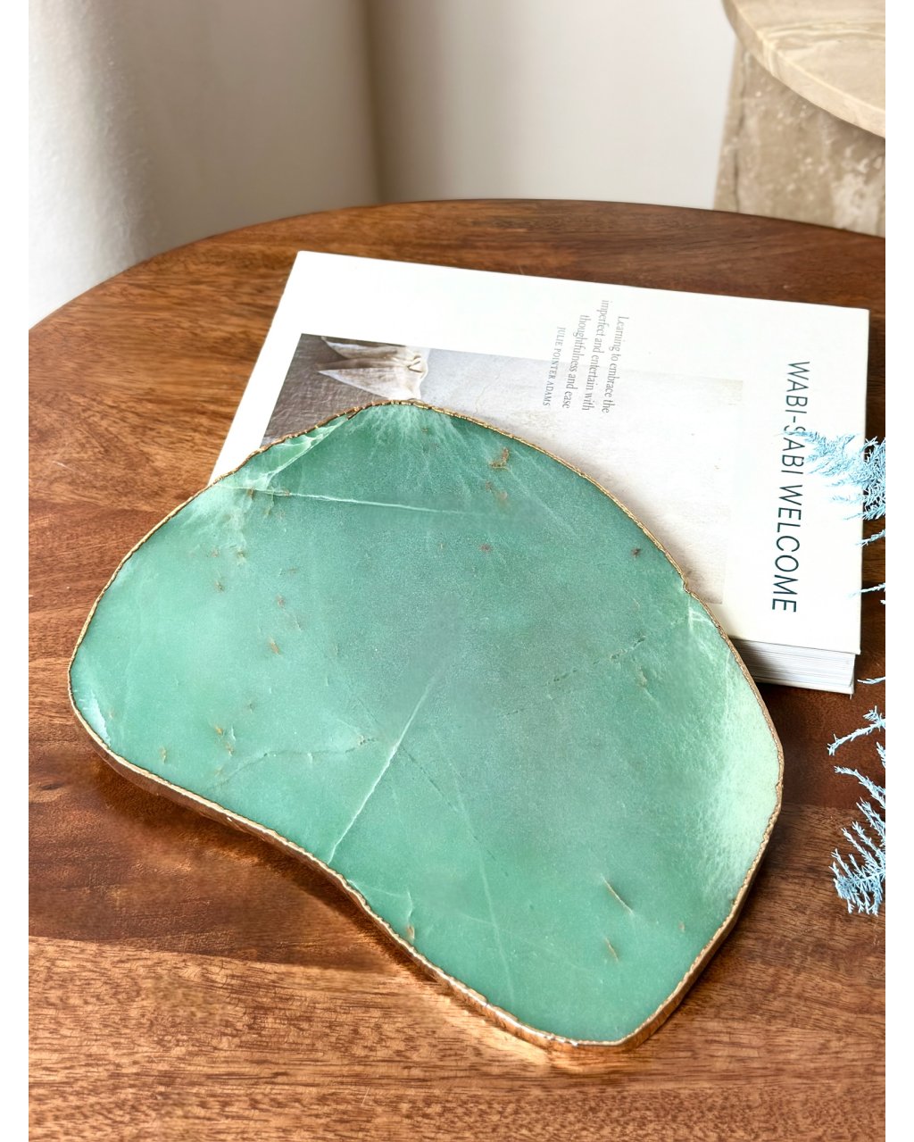 Jeho hluboká, uklidňující zelená barva symbolizuje rovnováhu, růst a obnovu životní energie. Nefrit je známý schopností harmonizovat emoce, podporovat vnitřní klid a přinášet pocit bezpečí a stability. V prostoru vytváří jemné, ale vytrvalé pole klidné síly, které pomáhá zpomalit mysl, posílit soustředění a navracet člověka k přirozenému rytmu života. Deska z nefritu je ideální pro každodenní rituály, aranžování krystalů, svíček, šperků nebo jako luxusní energetická podložka pro předměty, které si přejete harmonizovat.