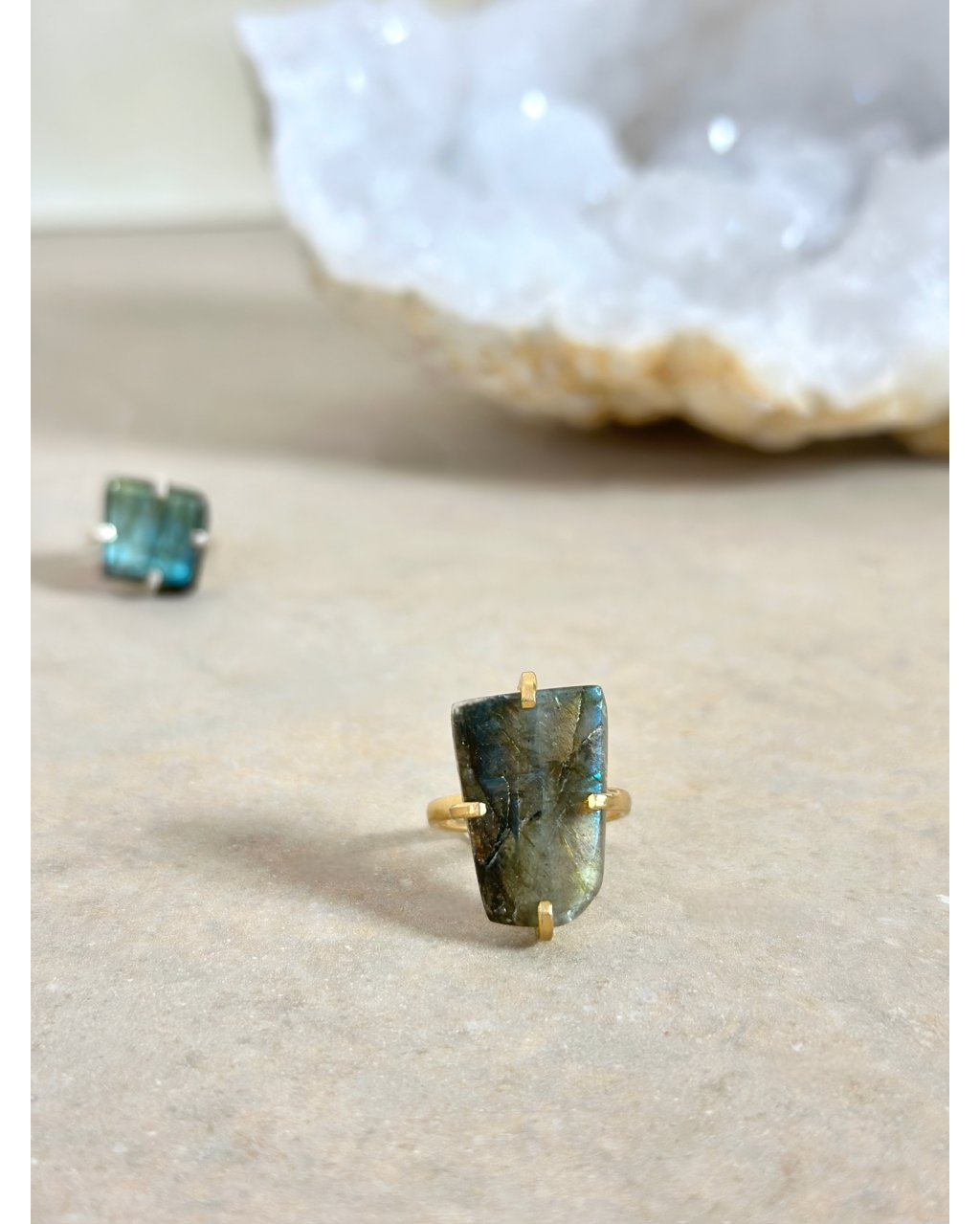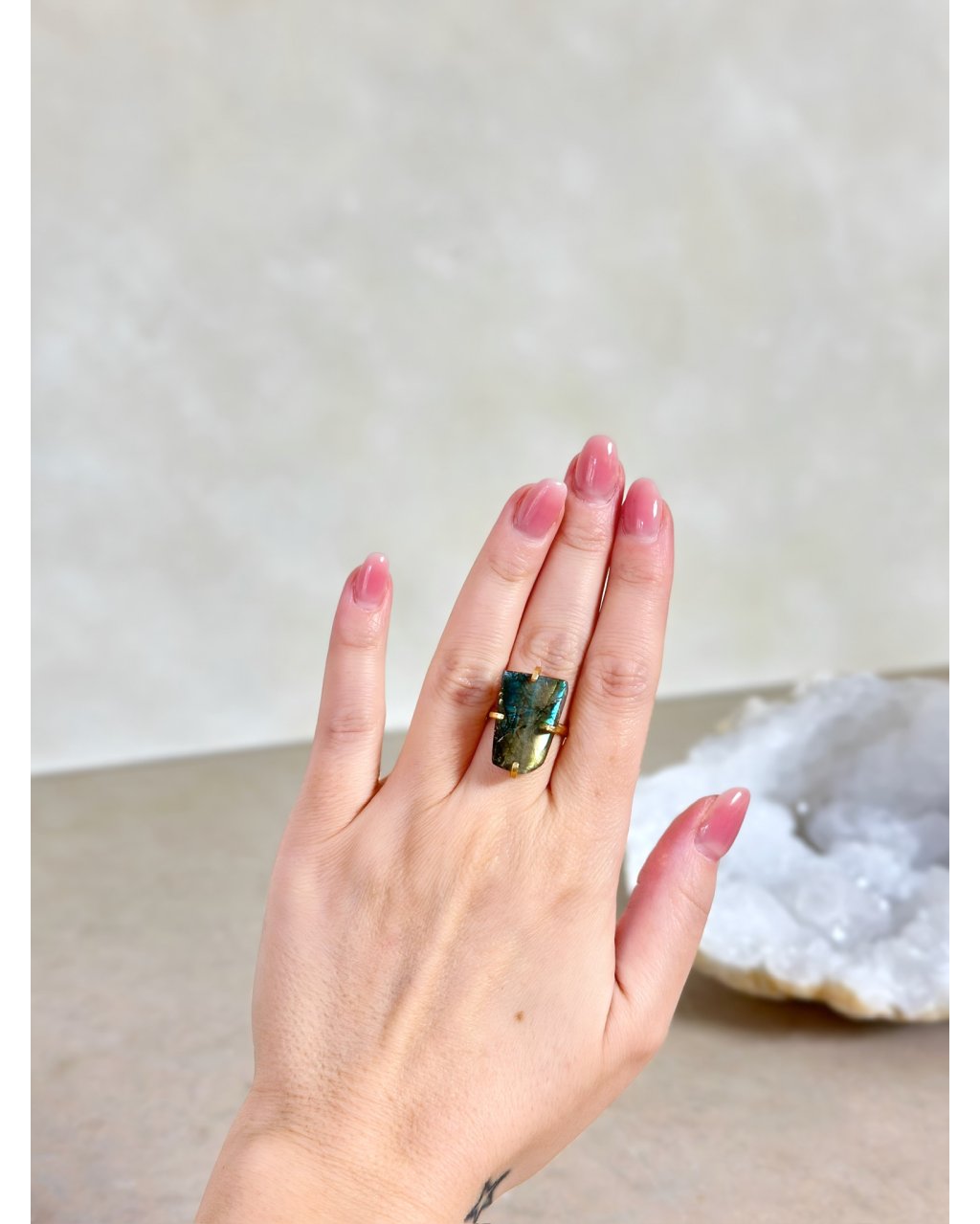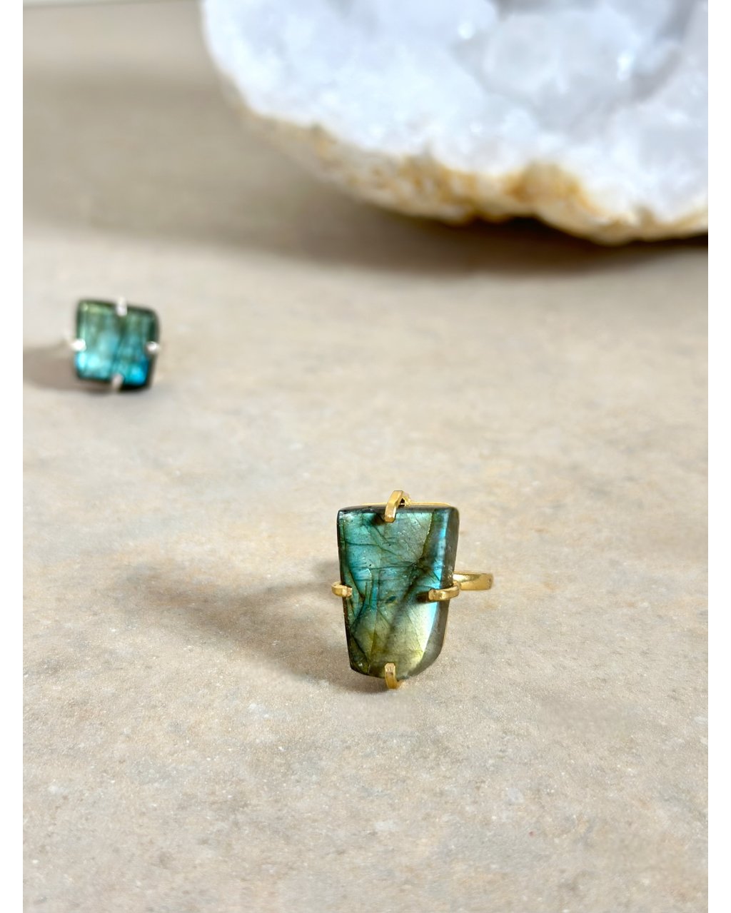 Labradorit k tomu pomůže i tehdy, když dáváš příliš mnoho a zapomínáš na sebe. Podporuje vnitřní hranice, chrání tvé pole a připomíná, že tvoje citlivost je dar, ne slabost. Tento prstýnek není náhodný výběr. Přichází ve chvíli, kdy už nehledáš krásu zvenčí, ale spojení, které tě podrží, zesílí a tiše povede dál.