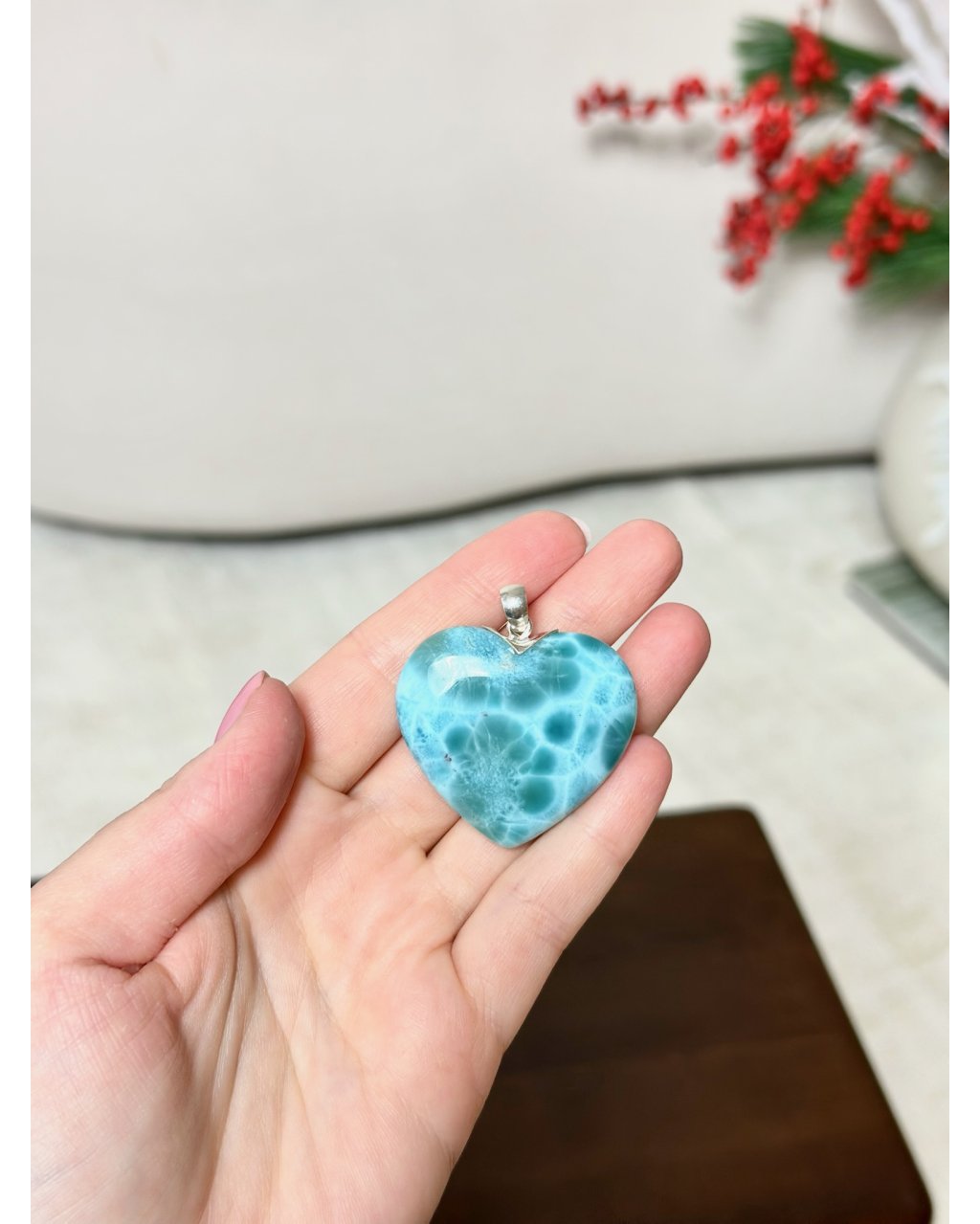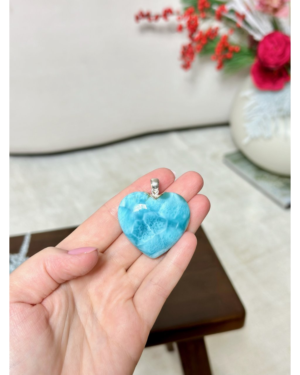 Zkamenělý šepot oceánu, otisk pradávné vody v srdci Země. Toto velké srdce z larimaru, ručně broušené z dominikánských rud, jako by si neslo paměť Atlantidy – ztraceného světa, kde se kameny používaly jako nosiče vědomí.