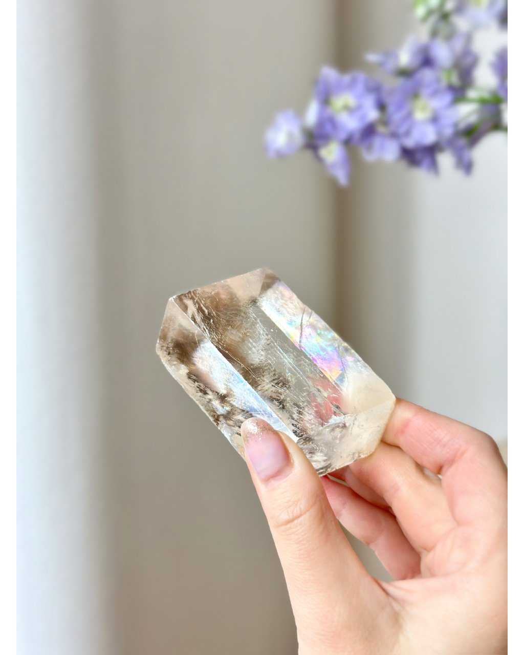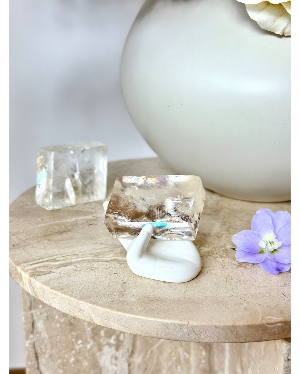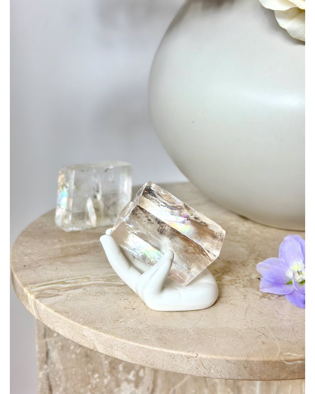 Optický kalcit s jemnými dendrity a nádhernou vnitřní duhou je krystalem, který doslova mění způsob, jakým vnímáme realitu. Jeho průzračná struktura vytváří typický optický efekt dvojlomu, kdy se svět i symboly za kamenem zdají být zdvojené, posunuté nebo jemně rozostřené, jako by nás vedl k pohledu za hranice běžného vidění. Dendritické kresby uvnitř kamene připomínají prastaré stromy, kořeny a mapy života, zatímco duha vnáší do celku světlo, naději a vyšší vibraci.
