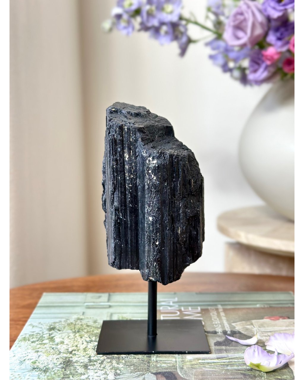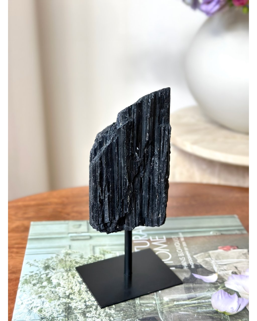 Tento krásně rostlý turmalín na podstavci působí silně a velmi vědomě. Jeho struktura je přirozená a živá, jako by kámen stále „stál ve službě“ prostoru, ve kterém se nachází. Nejde jen o estetický solitér, ale o stabilní bod, který drží hranice na hlubší úrovni.