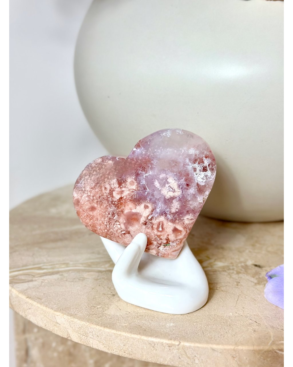 Stříbrný stojánek dodává srdci vznešenou eleganci a zároveň jej jemně pozvedá, aby jeho energie mohla volně proudit do prostoru. Celý kousek tak působí jako malý oltář lásky, intuice a harmonie, který se stává přirozeným magnetem pro oko i duši.